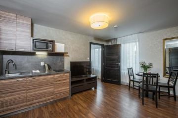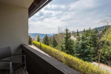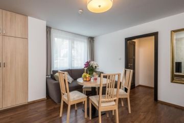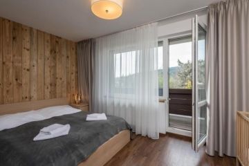 Prostorný plně vybyvený rodinný apartmán se dvěma oddělenými ložnicemi v prvním nadpodlaží bez možnosti výtahu s vlastním venkovním posezením a balkonem.
