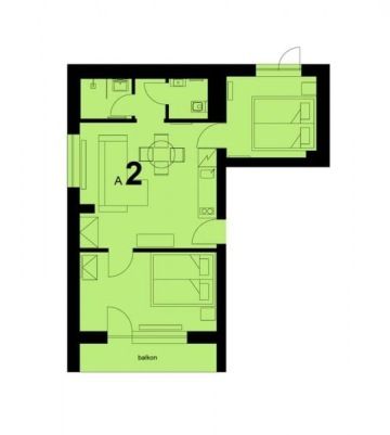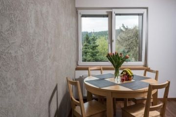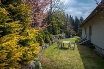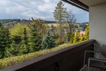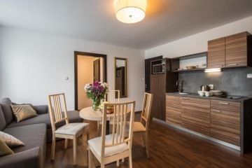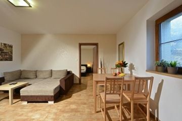 Plně vybyvený rodinný apartmán se dvěma oddělenými ložnicemi v prvním nadpodlaží bez možnosti výtahu s vlastním venkovním posezením a balkonem.